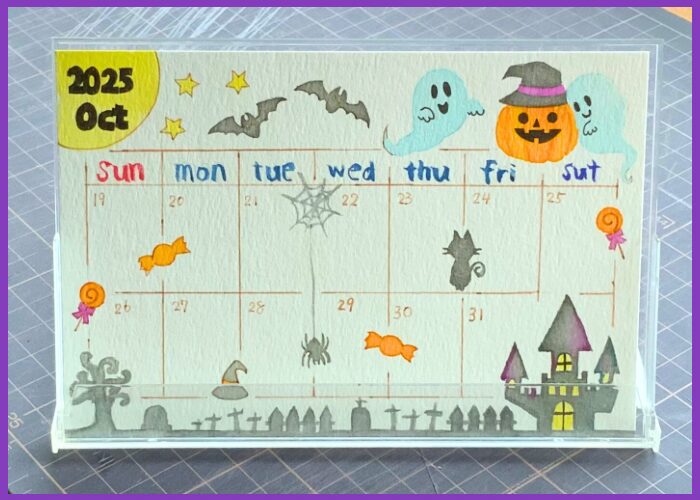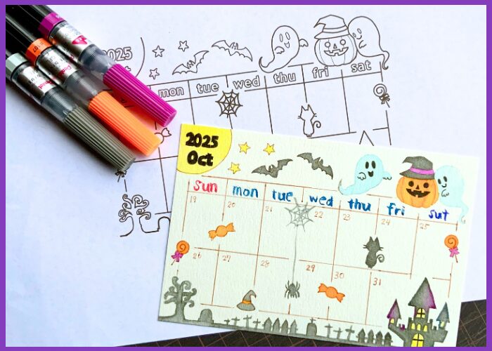 水彩カラー筆ペンで楽しむ、ハロウィンの手描きカレンダー