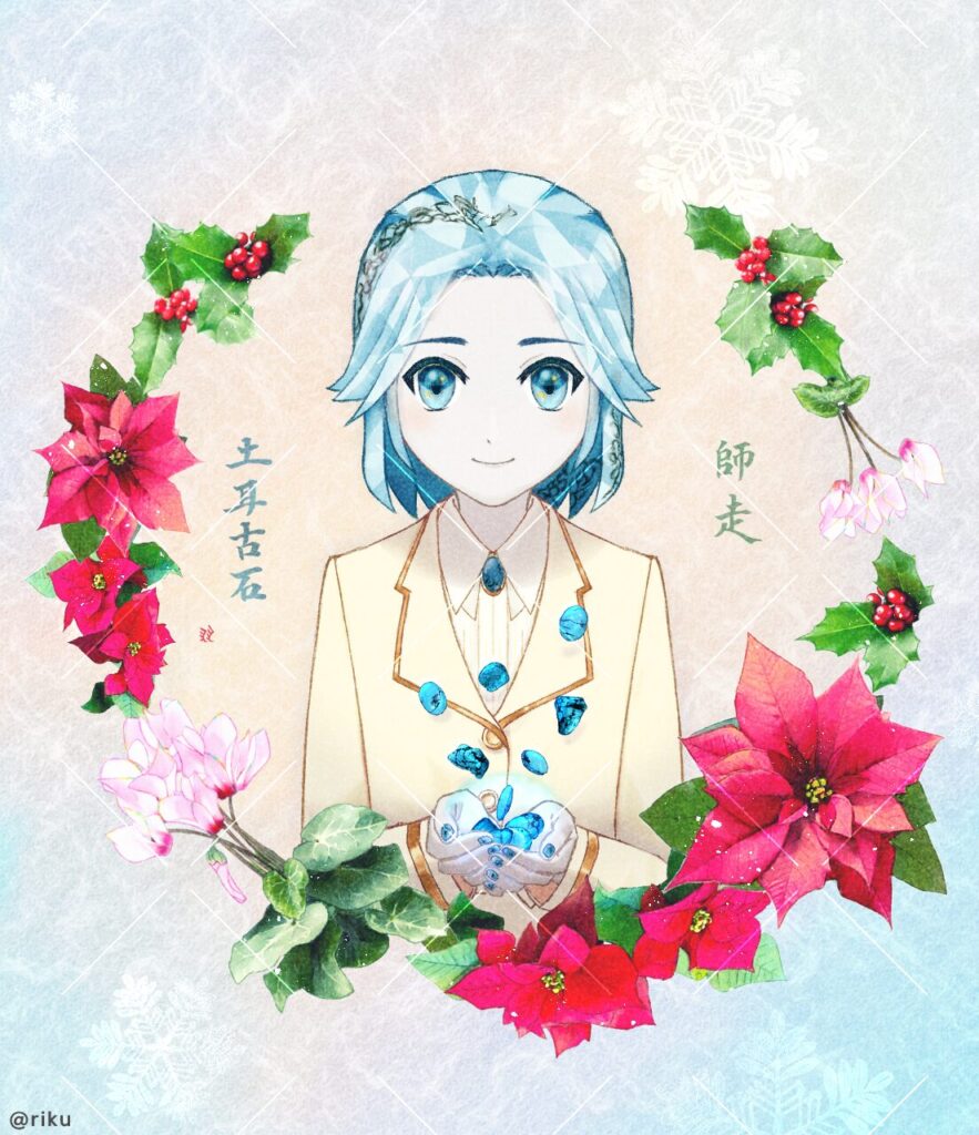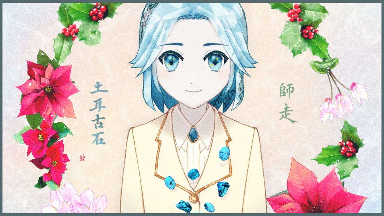 今回は「12月」。ターコイズをモチーフにしたキャラクターと、ポインセチアとシクラメンとセイヨウヒイラギを描きました。