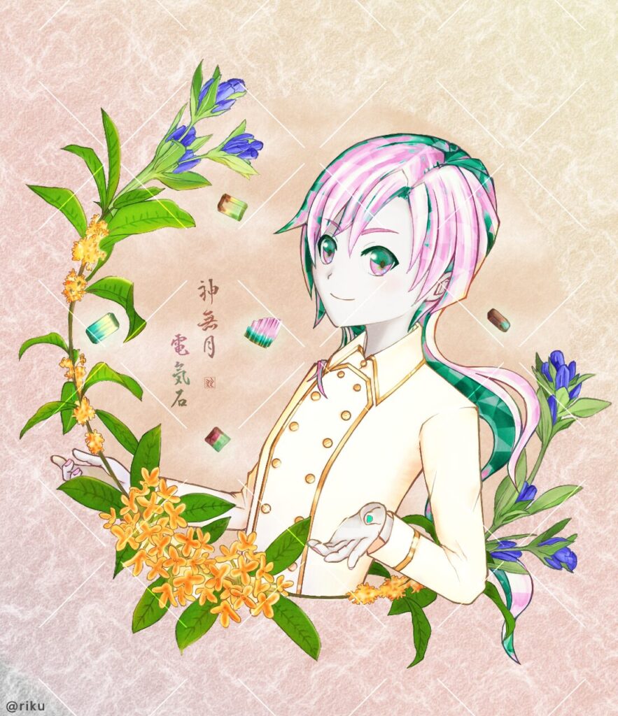 今回は「10月」。トルマリンをモチーフにしたキャラクターと、金木犀とリンドウ(竜胆)を描きました。