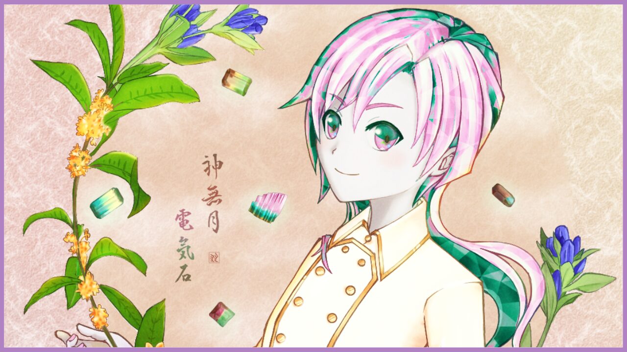 今回は「10月」。トルマリンをモチーフにしたキャラクターと、金木犀とリンドウ(竜胆)を描きました。